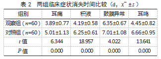 2.2两组临床症状消失时间比较观察组耳痛、积液、鼓膜异常、耳鸣等临床症状消失时间均短于对照组,差异有统计学意义(P<0.05)。见表2。