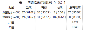 2.1两组临床疗效比较观察组治疗总有效率为95.00%(57/60),高于对照组的83.33%(50/60),差异有统计学意义(P<0.05)。见表1。