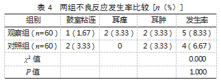 2.4两组不良反应发生率比较观察组不良反应发生率为8.33%,对照组不良反应发生率为6.67%。两组不良反应发生率比较,差异无统计学意义(P>0.05)。见表4。