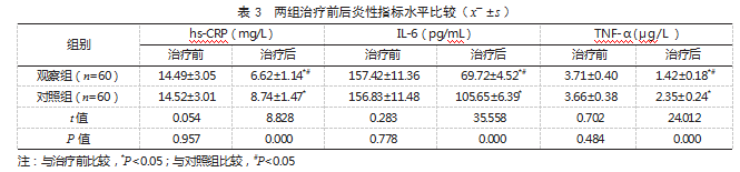 2.3两组治疗前后炎性指标水平比较治疗前,两组hs-CRP、IL-6、TNF-α水平比较,差异均无统计学意义(P>0.05);治疗后,两组hs-CRP、IL-6、TNF-α水平均低于治疗前,且观察组低于对照组,差异有统计学意义(P<0.05)。见表3。