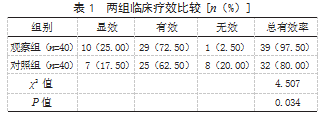 2.1两组临床疗效比较观察组治疗总有效率为97.50%,高于对照组的80.00%,差异有统计学意义(P<0.05)。见表1。