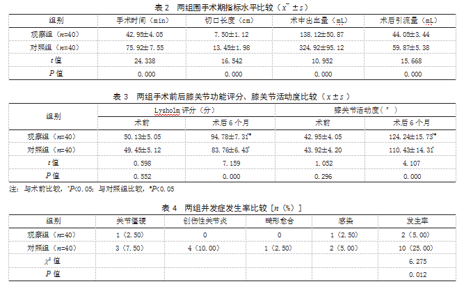 1.3观察指标(1)比较两组临床疗效。术后6个月入院复查,显效:疼痛、肿胀消失,骨折断面愈合,检查可见骨痂;有效:疼痛、肿胀症状好转,可维持基础活动,骨折断面愈合;无效:症状未见改善,骨折端未愈合,无法正常活动。总有效率=(显效+有效)例数/总例数×100%。(2)比较两组围手术期指标水平,包括手术时间、切口长度、术中出血量、术后引流量。(3)比较两组手术前后膝关节功能评分和膝关节活动度。术前、术后6月,参照Lysholm膝关节评分评估膝关节功能,包括疼痛、不安定度、闭锁感、肿胀度、跛行、楼梯攀爬、蹲姿和使用支撑物,总分0~100分,评分越高膝关节功能越好;使用数显万能角度尺(苏州瑞萨计量仪器有限公司,DRI-360D型)测量膝关节活动度。(4)比较两组并发症发生率。
