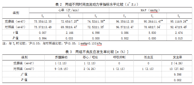 2.2两组不同时间血流动力学指标水平比较T0时,两组心率、MAP水平比较,差异均无统计学意义(P>0.05);T1、T2时,两组心率、MAP水平均低于T0时,但观察组高于对照组,差异有统计学意义(P<0.05)。见表2。