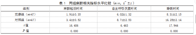 2.1两组麻醉相关指标水平比较观察组麻醉起效时间、自主呼吸恢复时间、睁眼时间均短于对照组,差异有统计学意义(P<0.05)。见表1。