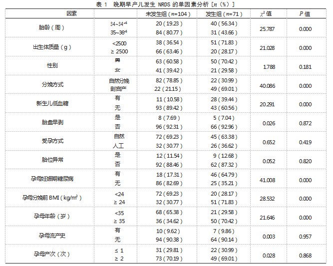 本研究结果显示,175例晚期早产儿中,71例发生NRDS,发生率为40.57%。提示晚期早产儿发生NRDS的风险较高,因此有必要探讨其发生NRDS的危险因素,以期为早期识别与精准干预提供依据。