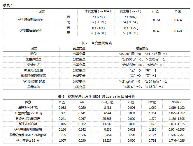 1.3观察指标(1)晚期早产儿NRDS发生情况。(2)晚期早产儿发生NRDS的单因素分析。(3)晚期早产儿发生NRDS的Logistic回归分析。