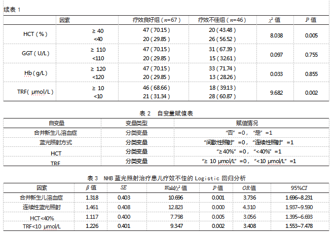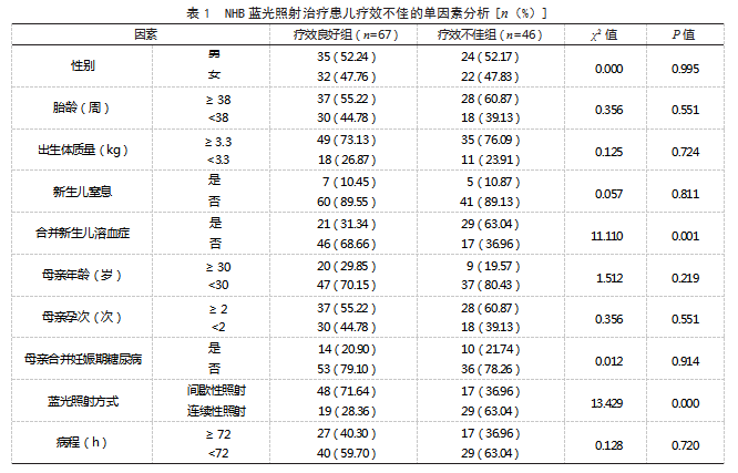 2.1 NHB患儿蓝光照射治疗效果113例NHB蓝光照射治疗患儿中,疗效不佳有46例,发生率为40.71%,纳入疗效不佳组,其余纳入疗效良好组。