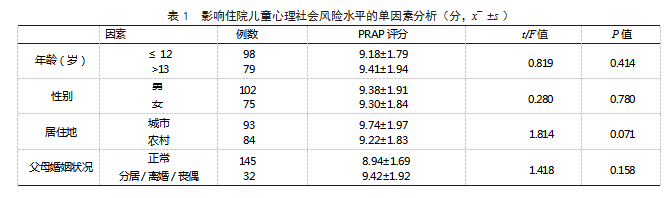2.1统计住院患儿心理社会风险水平177例患儿PRAP评分为3~19分,平均(9.32±1.87)分。