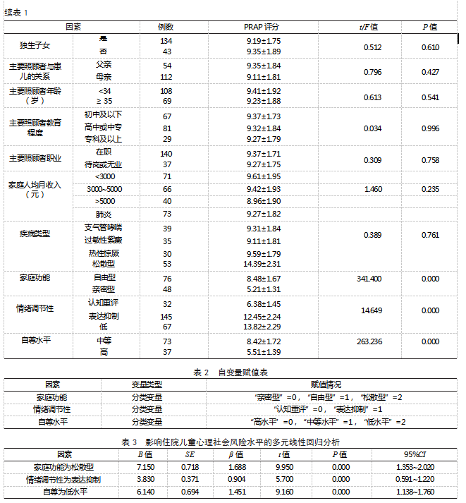 2.2影响住院患儿心理社会风险的单因素分析不同年龄、性别、居住地、父母婚姻状况、独生子女、主要照顾者与患儿的关系、主要照顾者年龄、主要照顾者教育程度、主要照顾者职业、家庭人均月收入等患儿的PRAP评分比较,差异均无统计学意义(P>0.05);家庭功能为松散型、情绪调节性为表达抑制、自尊为低水平患儿的PRAP评分较高,差异均有统计学意义(P<0.05)。见表1。
