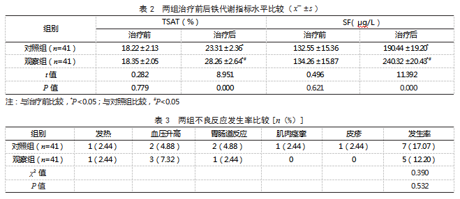 2.2两组治疗前后铁代谢指标水平比较治疗前,两组TSAT、SF水平比较,差异均无统计学意义(P>0.05);治疗后,两组TSAT、SF水平均高于治疗前,且观察组高于对照组,差异有统计学意义(P<0.05)。见表2。