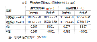 比较两组患者尿流动力学指标水平,结果显示,两组患者最大尿流率和残余尿量相较于治疗前均得到有效改善,且研究组最大尿流率高于对照组,残余尿量少于对照组,差异均有统计学意义(P均<0.05)。见表3。
