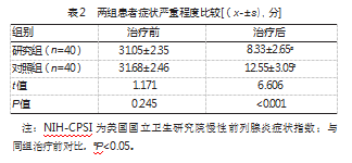 治疗后,两组NIH-CPSI评分比较结果显示,研究组患者症状改善程度优于对照组,差异有统计学意义(P<0.05)。见表2。