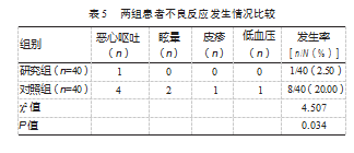 与对照组不良反应发生率(20.00%)比较,研究组为2.50%,研究组明显低于对照组,差异有统计学意义(P<0.05)。见表5。