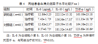 比较两组患者的血清炎症因子水平,结果显示,两组患者血清IL-8、IL-10、TNF-α水平相较于治疗前均明显下降,且研究组各项炎症因子水平较对照组更低,差异均有统计学意义(P均<0.05)。见表4。