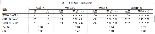 便利选取2023年4月—2025年6月菏泽市妇幼保健院及山东省立医院诊治的186例RMPP患儿为研究对象,根据治疗方案将其分为3组,包括常规组、研究1组、研究2组,各62例。常规组接受阿奇霉素序贯疗法+布地奈德雾化治疗方案,研究1组在常规组基础上联合低剂量甲泼尼龙治疗,研究2组在常规组基础上联合高剂量甲泼尼龙治疗。3组患儿一般资料对比,差异均无统计学意义(P均>0.05),见表1,具有可比性。本研究经菏泽市妇幼保健院伦理委员会审核批准(2023-HZFY-013)。患儿家属对本研究均知情同意,且签署知情同意书。
