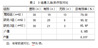 3组间总有效率比较,差异有统计学意义(P<0.05);研究2组总有效率高于常规组,差异有统计学意义(P<0.05);而研究1组和研究2组比较,差异无统计学意义(P>0.05)。见表2。