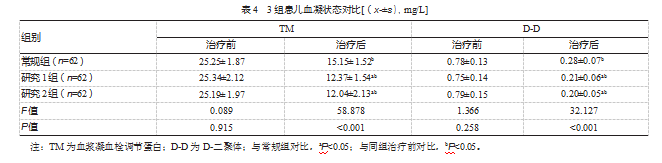 治疗后,3组TM、D-D水平均低于治疗前,差异均有统计学意义(P均<0.05);且研究1组、研究2组均低于常规组,差异均有统计学意义(P均<0.05);而研究1组、研究2组比较,差异均无统计学意义(P均>0.05)。见表4。