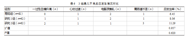 3组一过性血糖升高、心动过速等不良反应总发生率比较,差异无统计学意义(P>0.05)。见表6。