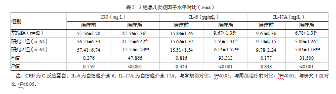 (4)炎症因子水平:治疗前、治疗结束后24 h,采集患儿静脉血3 mL,离心15 min(3 500 r/min,离心半径12 cm),以ELISA检测C反应蛋白(C-reactive protein,CRP)、白细胞介素6(interleukin 6,IL-6)、白细胞介素17A(interleukin 17A,IL-17A)。