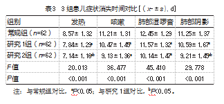 (2)症状消失时间:记录3组患儿发热、咳嗽、肺部湿啰音、肺部阴影的消失时间。
