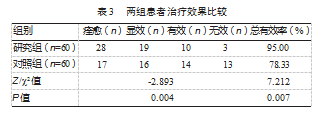 观察组治疗总有效率高于对照组,差异有统计学意义(P<0.05)。见表3。