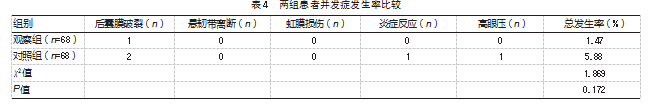 两组患者并发症总发生率比较,差异无统计学意义(P>0.05)。见表4。