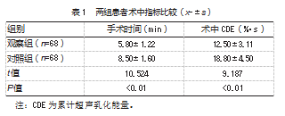 与对照组相比,观察组手术时间较短,术中CDE较低,差异均有统计学意义(P均<0.05)。见表1。