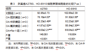 Transwell实验数据显示,与对照组比较,OA低浓度组、OA中浓度组和OA高浓度组卵巢癌A2780、HO-8910细胞穿膜细胞数降低;与OA高浓度组比较,OA+Fer-1组卵巢癌A2780、HO-8910细胞穿膜细胞数升高,差异均有统计学意义(P均<0.05)。见表3。