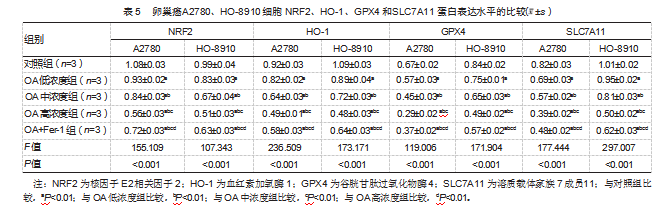 Western blot实验数据显示,与对照组比较,OA低浓度组、OA中浓度组和OA高浓度组卵巢癌A2780、HO-8910细胞NRF2、HO-1、GPX4、SLC7A11蛋白表达水平下调;与OA高浓度组比较,OA+Fer-1组卵巢癌A2780、HO-8910细胞NRF2、HO-1、GPX4、SLC7A11蛋白表达水平上调,差异均有统计学意义(P均<0.05)。见表5。
