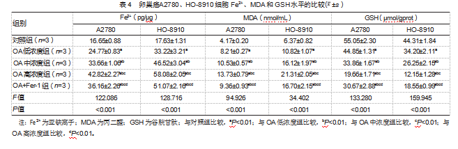 与对照组比较,OA低浓度组、OA中浓度组和OA高浓度组卵巢癌A2780、HO-8910细胞的Fe2+、MDA水平增高,GSH水平降低;与OA高浓度组比较,OA+Fer-1组卵巢癌A2780、HO-8910细胞的Fe2+、MDA水平降低,GSH水平增高,差异均有统计学意义(P均<0.05)。见表4。