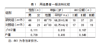 随机选取2022年3月—2025年3月南通市第三人民医院收治的150例脓毒症伴AKI患者为研究对象,按照治疗方法分为对照组(75例,实施CRRT治疗)及研究组(75例,实施前列地尔联合CRRT治疗)。两组性别、年龄、AKI分期比较,差异均无统计学意义(P均>0.05),资料均衡可比,见表1。患者或家属均知情同意本研究,且本研究经南通市第三人民医院医学伦理委员会审批(EK2021061)。