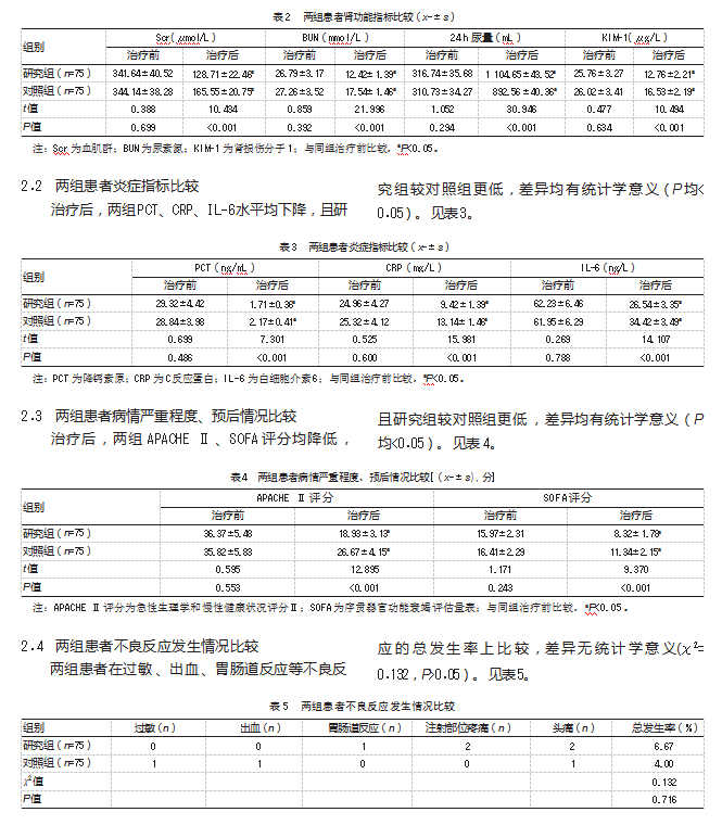 采用SPSS 26.0统计学软件处理数据,肾功能指标、炎症指标、病情严重程度等计量资料经Shapiro-Wilk检验符合正态分布,以(x-±s)表示,组间比较行两独立样本t检验,组内比较行配对样本t检验。不良反应为计数资料,以例数(n)和率(%)表示,组间比较行χ2检验。P<0.05为差异有统计学意义。