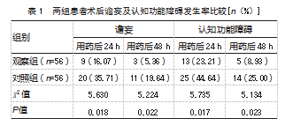 2.1两组患者术后谵妄及认知功能障碍发生率比较