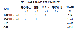 观察组镇痛有效率为92.86%(52/56),高于对照组的78.57%(44/56),差异有统计学意义(χ2=4.667,P=0.031)。
