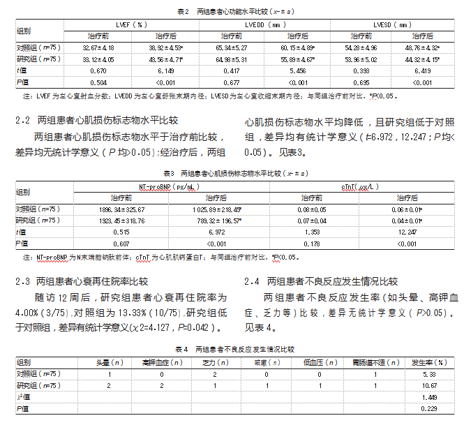 文内所有数据均采用SPSS 26.0统计学软件分析,属于计量资料的心功能指标、心肌损伤标志物水平经S-W检验均符合正态分布,用(x-±s)表示,组间比较采用两独立样本t检验,组内比较采用配对样本t检验;属于计数资料的不良反应发生情况、心衰再住院率用例数(n)和率(%)表示,行χ2检验。P<0.05为差异有统计学意义。