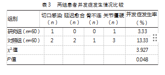 研究组并发症发生低于对照组,差异有统计学意义(χ2=3.927,P<0.05)。见表3。