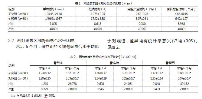 采用SPSS 26.0统计学软件处理数据,围术期相关指标、X线骨痂愈合情况为计量资料,经检验符合正态分布,以(x-±s)表示,组间比较行两独立样本t检验,组内比较行配对t检验;并发症为计数资料,以例数(n)和率(%)表示,组间比较行χ2检验。P<0.05为差异有统计学意义。