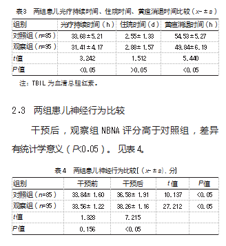 采用SPSS 26.0统计学软件处理数据,TBIL、IBIL、光疗持续时间、住院时间、黄疸消退时间、神经行为属于计量资料,经Shapiro-Wilk检验符合正态分布,以(x-±s)表示,组间比较行两独立样本t检验,组内比较行配对样本t检验;再次入院率为计数资料,以例数(n)和率(%)表示,组间比较行χ2检验。P<0.05为差异有统计学意义。