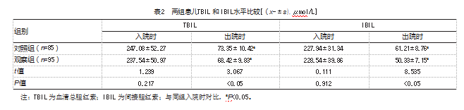 出院时,观察组的TBIL和IBIL水平均低于对照组,差异均有统计学意义(P均<0.05)。见表2。