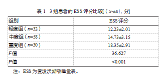 使用SPSS 26.0统计学软件分析数据。经Shapiro-Wilk检验计量资料(ESS评分)符合正态分布,以(x-±s)表示,多组比较行单因素方差分析;采用Pearson相关系数进行相关性分析,P<0.05为差异有统计学意义。
