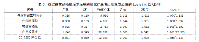 2.2腹腔镜宫颈癌根治术后辅助放化疗患者出现复发恐惧的单因素分析两组年龄、BMI、家庭月收入、吸烟史、饮酒史、合并糖尿病、合并高血压、文化程度、婚姻情况、绝经、孕次、肿瘤家族史、病程、病理类型、肿瘤分期、分化程度、肿瘤最大直径、手术时间、术中失血量、淋巴结转移、浸润深度比较,差异均无统计学意义(P>0.05);两组导尿管留置时间、住院时间、脉管癌栓、放化疗方式、CD-RISC评分比较,差异均有统计学意义(P<0.05)。见表1。