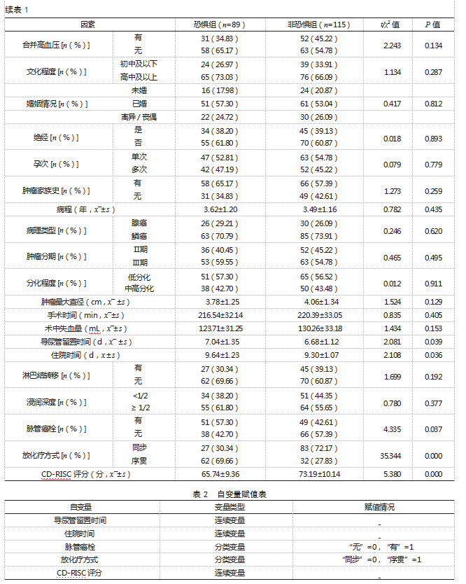 1.2方法(1)基线资料收集:从电子病历系统收集患者基线资料,包括年龄、体质量指数(BMI)、家庭月收入、吸烟史、饮酒史、合并糖尿病、合并高血压、文化程度、婚姻情况、绝经、孕次、肿瘤家族史、病程、病理类型、肿瘤分期、分化程度、肿瘤最大直径、手术时间、术中失血量、导尿管留置时间、住院时间、淋巴结转移情况、浸润深度(<1/2:肿瘤侵入宫颈基质的厚度不足宫颈全层的一半,≥1/2:肿瘤侵入宫颈基质的厚度达到或超过宫颈全层的一半)、脉管癌栓、放化疗方式;采用Connor-Davidson心理弹性量表(CD-RISC)评估心理弹性,共25个条目,每个条目0~4分,总分0~100分,分值越高心理弹性越强,其中评分≤60分为心理弹性低,61~69分为中等,70~79分为较强,80~100分为极高[7]。(2)复发恐惧判定:放化疗疗程结束后,采取恐惧疾病进展简化量表(FoP-Q-SF)评估,包括社会家庭和生理健康两个方面,共12个条目,每个条目1~5分,总分12~60分,其中评分≥24分判定为出现明显的复发恐惧[8]。根据结果将患者分为恐惧组和非恐惧组。(3)质量控制:发放量表前由工作人员向患者详细介绍本次调查的目的及意义,要求患者独立完成量表内容,时间为30 min。回收问卷时检查填写是否完整,若有遗漏指导患者完善;本次调查共发放210份调查问卷,回收204份,回收率为97.14%。