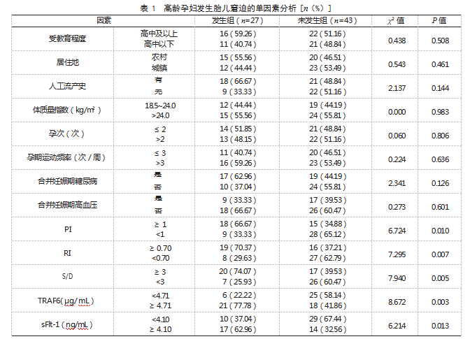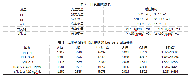 摘要:PI≥1、RI≥0.70、S/D≥3、TRAF6≥4.71μg/mL、sFlt-1≥4.10 ng/mL均为高龄孕妇发生胎儿窘迫的危险因素。